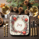 Elegant Christmas paper plates with red ornaments, pine branches, red berries and gold glitter snowflakes.