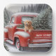 A golden retriever sits happily in the bed of a classic red truck which is carrying a freshly cut Christmas tree.