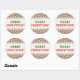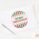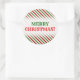 This round Christmas sticker design features a pattern of red, white and green stripes. These are colors commonly associated with Christmas. It also features the warm greeting, "MERRY CHRISTMAS!", in red and green colored text. [~Z0000114]