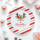 Christmas Reindeer girl birthday party plates with cute reindeer face and Red and Gold Glitter Stripes.