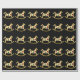 Christmas wrapping paper with beautiful gold rocking horses that are decorated with holiday design elements including a Christmas tree, wreath, and holiday bells. Gift wrap your prsents in style, holiday style.