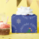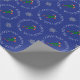 The text on this sport-themed wrapping paper is in white and can be edited for your preferred greeting, or simply use the supplied: "MERRY CHRISTMAS HAPPY NEW YEAR". The design shows a pictogram runner (in christmas green) wearing a santa hat and carrying a festive parcel. The background is navy, and there are golden-colored snowflakes too.