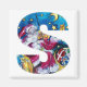 S bold alphabet letter initial design. Musical ,whimsical and artistic watercolor painting with vibrant red ,blue, yellow, white colors by Bulgan Lumini (c). Santa Claus is playing violin in the snowy winter night under the blue sky ,moon and yellow stars with a funny ,expressive owl ,cat and his Christmas sack full of colourful presents