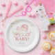 The "Santa Baby" shower paper plates has a sweet, festive design, featuring a baby in a pink Santa hat with soft clouds and stars. It uses playful red script and pastel tones, creating a cozy holiday feel, perfect for a winter baby shower.