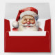 Beautiful, bright red envelope with Santa Claus on the inside. He is wearing glasses and has a big smile.