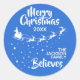 Show how much you believe in the magic of Christmas and Santa Claus with this Christmas family round sticker featuring the silhouette of Santa's sleigh in white with his reindeers, flying in a trail of stars.