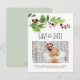 A modern farmhouse style save the date card that lets friends and family know about your Christmas wedding or December annual holiday party! This simple trendy design features my original hand painted watercolor holly and red berries. Your personalized greeting is set in a cute hand lettered script typography. The card reverses to a solid complimentary green color. Use the template fields to add your personalized information, photo, wedding date and more. A boho chic yet botanical choice to mail to friends and family announcing your winter wedding. Artwork and Design by Victoria Grigaliunas. To see more moving announcements visit VG Invites on Zazzle