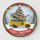 This cheerful clock features a classic yellow school bus loaded with brightly wrapped presents, parked in a snowy winter forest next to a decorated Christmas tree. The bus is framed by a festive wreath of pine boughs and ornaments, with a prominent red banner that reads "MERRY CHRISTMAS" across the bottom. This design blends a familiar vehicle with warm holiday cheer, making it a unique seasonal decoration.
