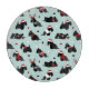 Cute Scottie dogs dressed in festive holiday outfits, Santa hats and argyle sweaters with scattered Christmas ornaments on a blue background.