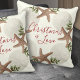 Christmas pillow with wreath of starfish and sand dollars on off-white. The beach wreath is made up of brown, five-legged sea stars, white sand dollars, and sprigs of green holly. "Christmas is Love" dark red text in the center. The same design and wording is on both sides of holiday pillows that have many options and two sizes.