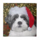A Shih Tzu Dog Breed Photograph wearing a Santa hat, laying in front of the Christmas tree during the Holiday Seasons to greet a Merry Christmas.
