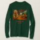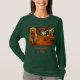 Dark green, long sleeve, womens Christmas shirt featuring a goldendoodle by the Christmas tree