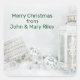 Lantern candle and silver ornaments in snow with Silent Night music.
