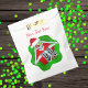 This party favour bag has a funny skeleton holding Christmas tree ornaments up to his eyes wearing a red Santa hat inside a bright red and green wavy circle. Customise your text with the template.