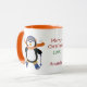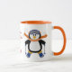 This cute mug features an adorable snow skiing penguin and your own personalized text. The penguin is dressed in an orange scarf and blue goggles, and is coasting on his skiis. A few snowflakes drift down around him. The image is repeated twice, with three text fields for your custom text in between. Festive and bright!
