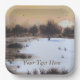 This atmospheric snow scene on this art plate has a picture of a little snow covered landscape. In the foreground of the scenic image are tufts of snow covered grasses and shrubs. In the background the bare winter branches of the distant trees are draped in seasonal snow and a thick layer of soft white freshly fallen snow covers the grassy plains. The festive image is set against an orangey sunset sky. This little water-colour painting is evocative of cold December day and looks really special on these unique Christmas paper plates. The title of the original painting is “Snow On The Plains.”This is a customizable plate, you can personalize it with your own text.