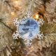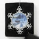 Pewter snowflake Christmas ornament shown with a winter snow scene print.
