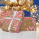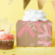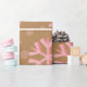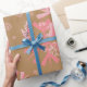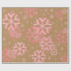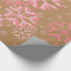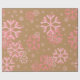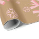 This Christmas Holiday wrapping paper is shown on a Tan background with snowflakes printed in different sizes from super large to smaller in a soft warm Carnation Pink and pale Pink. On glossy paper.