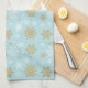 This kitchen towel is shown in a Aqua and Gold colors with a classic Christmas holiday snowflakes print.
