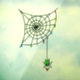 Cute and creepy green decorated spider hangs from his corner web holding an ornament. The spiderweb is covered in bright Christmas lights. Great twist on a traditional holiday image, by Briana Blair.