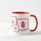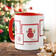 Christmas Modern Stamp Holidays Winter Personalized Name Tea Coffee Mug features the text "Merry Christmas" in red modern hand lettered calligraphy script typography accented with Christmas trees, snowflakes and snowman in red and white polka dots. Perfect for gifts for Christmas and Holiday parties. Designed by ©Evco Studio www.zazzle.com/store/evcostudio