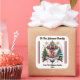 A cheerful holiday sticker adorns a neatly wrapped gift, featuring vibrant colors and a festive design. Surrounded by pine branches and wrapped presents, it captures the joyful essence of Christmas celebrations, making every gift extra special.