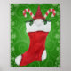 Decorate your home with this economical artwork poster which has a red and white Christmas stocking with a cute gnome wearing a pointy hat and candy canes in the top of the stockings on a green background with swirls and snowflakes.