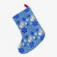 Graphic image of three dimensional snowflakes in shades of blue and white, are replicated across product. Background is a medium blue.