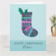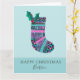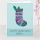 A fun patterned Christmas stocking in pinks and teal with a bunch of holly. The design is personalized with a name and greeting, both of which can be changed. the design sits on a light blue background on the front and back and this too can be changed.