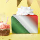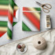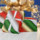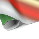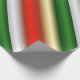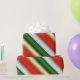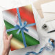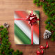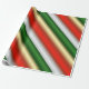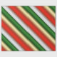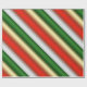 A colorful Christmas wrapping paper with diagonal stripes in the traditional Christmas colors of red, green and white.