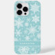 This personalized Christmas phone case features a teal blue and white snowflakes pattern and a template to type your name. It's a cute idea for winter holidays season.