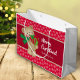 Wrap your gifts with seasonal cheer with this adorable holiday gift bag. Bag features a teddy bear wearing a green scarf and carrying Christmas gifts and a candy cane. The background is red and has white falling snowflakes. Across the middle is a dark red ribbon with a gold border and space for your Merry Christmas greeting and your family name.