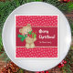 Add a touch of seasonal cheer to your kitchen table with this adorable holiday paper napkin. Paper napkin features a teddy bear wearing a green scarf and carrying Christmas gifts and a candy cane. The background is red and has white falling snowflakes. Across the middle is a dark red ribbon with a gold border and space for your Merry Christmas greeting and your family name. Makes a great addition to a holiday party!