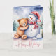 Christmas Teddy Bear With Snowman Holiday Card