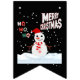 This bunting banner showcases the words "Merry Christmas Ho Ho Ho" in a unique print font with multi-colored letters and Christmas The Snowman wear red and white with snow falling in the background in this X-mas theme and style. All banners have single sided printing outdoor safe made with sturdy plastic polystyrene and thick plastic rope has (16) 5.5" x 8" swallowtail flags on a 6' long string.