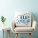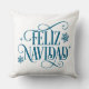 This Christmas throw pillow is shown with festive holiday Feliz Navidad snowflakes print.