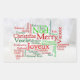 A colorful red and green word cloud of Merry Christmas greetings in many languages of the world over a background of white holiday decoration ornaments, tree branches and snow makes for a joyous expression of welcome to all. Best Christmas tidings to your and yours.