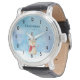 Modern watch with a cute snowman illustration. He is wearing a black stovepipe hat, holding a classic corn cob pipe, and wearing a red scarf. Standing in the cold white snow smiling and waving hello. The background is composed of a watercolor sky with blue and purple colors blending and mingling together. Customizable text says Christmas Time.