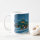 a festive drinking mug for the whole family featuring a snowy town squaire on christmas eve. lovely winter holiday souvenir with an exclusive design by frank glerum art.