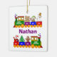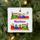 Bright and colorful Christmas decorations for kids with toy train carrying Santa and friends to spread Holiday Greetings.