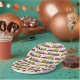 Bright and colorful Christmas party supplies for kids with toy train carrying Santa and friends to spread Holiday Greetings.