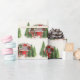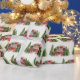 Wrapping paper with a cute and whimsical Christmas theme. A cozy trailer decorated for Christmas set among some pine trees.