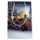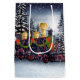 Old fashioned locomotive train running along the track with winter snowflakes falling and covered with Christmas holiday decorations train fans Christmas holiday gift bag