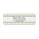 Address labels with a cute christmas pattern with a cream colored background with illustrations of a pastel greenish blue colored christmas tree and a pastel pink bauble with a ribbon in a repeating pattern.