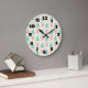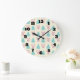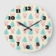 Clock with a cute christmas pattern with a cream colored background with illustrations of a pastel greenish blue colored christmas tree and a pastel pink bauble with a ribbon in a repeating pattern.