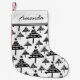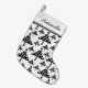 Modern and elegant Christmas stocking with a Christmas holiday pattern on a white background. Black and white simple Christmas trees with stars on the top. Personalize the stocking with your name. The name is in black script.