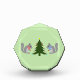 This awesome acrylic award features a digital art image of a pair of cute squirrels decorating a Christmas tree with brightly colored hazelnuts. The tree is green with a yellow star on top and each squirrel is holding a Hazelnut to eat and wearing a scarf to keep warm in the cold winter.