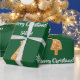 Modern Christmas gift wrap for kids, with a minimalist design that includes a gingerbread figure of Santa, a gingerbread Xmas tree, snowflakes, the greeting "Merry Christmas" in stylish typography, and a personalized name. On a Xmas green background.