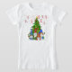 Four bearded little gnomes stand in front of a decorated Holiday tree on the front of this cute shirt. Each of the gnomes is brightly dressed and waving a greeting. Behind the tree is falling bright red ribbon and confetti. Christmas fun!