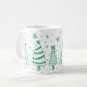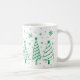 Elegant White Christmas Coffee Mug with Green inky Christmas Trees and Snowflakes illustration. This modern and chic white Christmas coffee mug is ideal for enjoying a hot drink, as a Christmas gift, or as a home decor item for an elegant snowy white christmas celebration. The green and white chic design features Digital Art based on Hand Drawn Christmas Trees and Snowflakes Doodles.